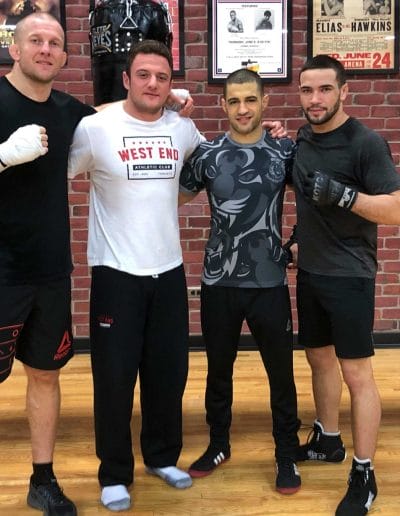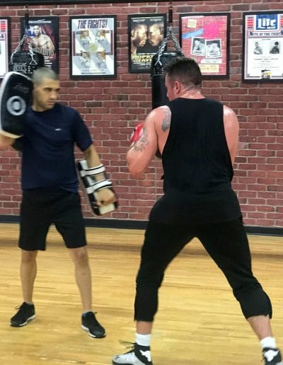 In the Muay Thai class, you work on and combine punches, kicks, knees and elbows. The classes combine partner drills utilizing Muay Thai pads, low kick shields, and various heavy bags while incorporating sport-specific strength and conditioning exercises.